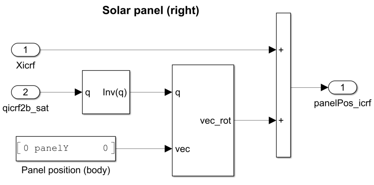 The left and right Solar panel subsystems calculate the position of the panels in ICRF. Their centers of mass is located 2.5 meters from the center of mass of the spacecraft bus along the body-y axis.
