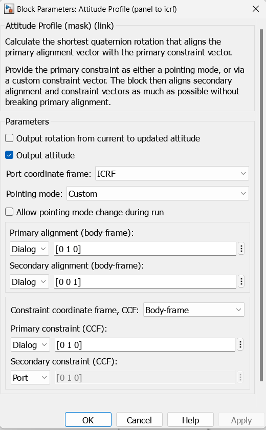 The desired attitude is nadir pointing, with the spacecraft body-z axis pointing nadir and the body-x axis aligning with the ICRF velocity vector. Therefore, the primary alignment vector is the body-z axis, the primary constraint vector is the unit vector pointing towards nadir, the secondary alignment vector is the body-x axis, and the secondary constraint vector is the unit vector along the ICRF velocity direction. Accordingly, the Pointing mode parameter of the Attitude Profile block is set to "Point at nadir", automatically setting the primary constraint vector to the nadir direction. The primary and the secondary alignment vectors are set to the body-z and x axes, respectively. The secondary constraint vector, the unit ICRF velocity vector, is input through the port .