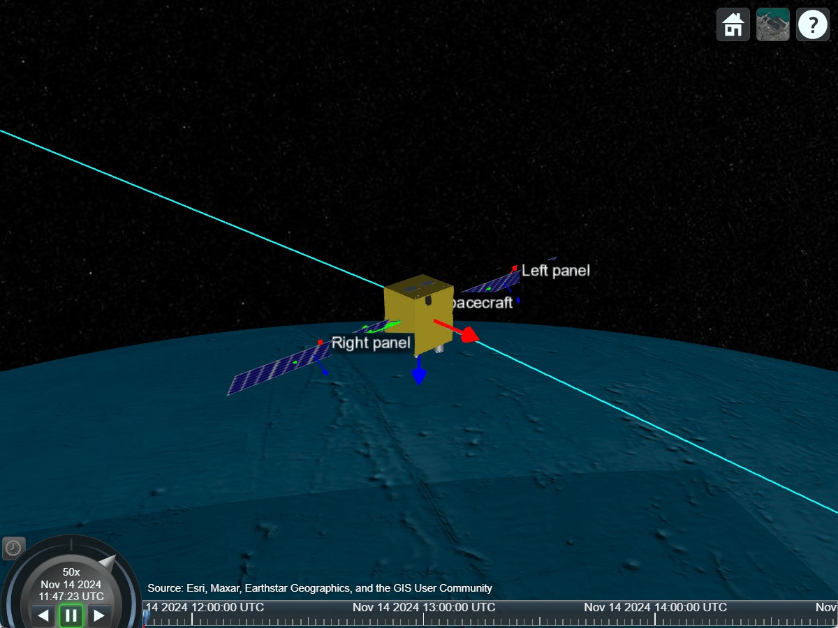 leftPanel = satellite(sc,leftPanelPosition,Name="Left panel"); leftPanel.Visual3DModel = 'leftPanel.glb'; rightPanel = satellite(sc,rightPanelPosition,Name="Right panel"); rightPanel.Visual3DModel = 'rightPanel.glb';