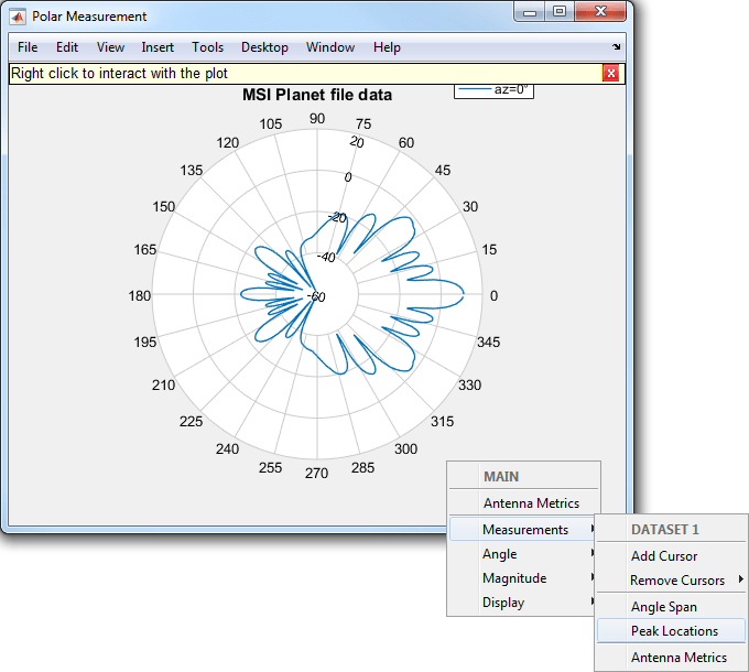 P = polarpattern(Vertical.Elevation,Vertical.Magnitude); P.TitleTop = "MSI Planet file data"; createLabels(P,"az=0#deg");