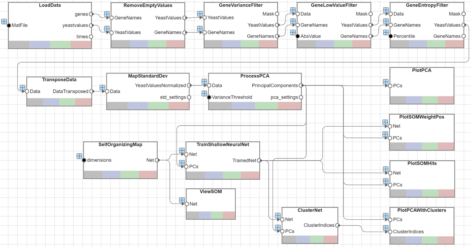 This example shows how to look for patterns in gene expression profiles using neural networks, facilitated with the Biopipeline Designer app. The example requires Deep Learning Toolbox™ and Bioinformatics Toolbox™.