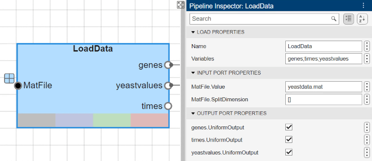 The pipeline starts by first loading data into MATLAB® using a built-in Load block named LoadData. The data file yeastdata.mat was set by entering the appropriate filename in the MAT-file input port value within the Pipeline Inspector pane.