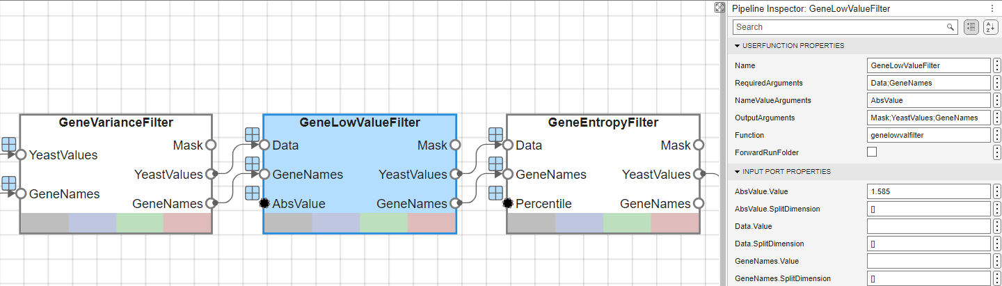 The function that is used for each of these blocks can be accessed through the Function property of the corresponding UserFunction blocks. You can specify the values for AbsVal and Percentile in the Pipeline Inspector pane for the GeneLowValueFilter block and GeneEntropyFilter block, respectively. The next figure shows the GeneLowValueFilter block, where the threshold is defined as 1.585 within the AbsValue.Value text editor.