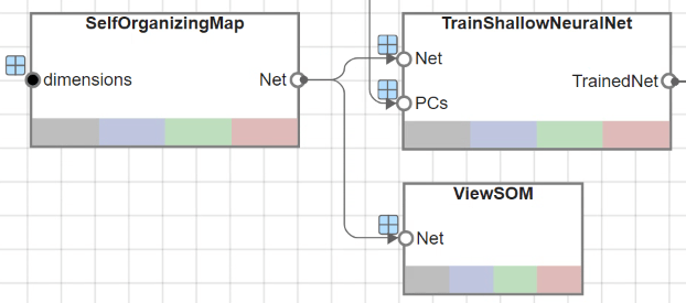 The UserFunction block ViewSOM calls the view function on the generated SOM for an overview of the network's architecture.