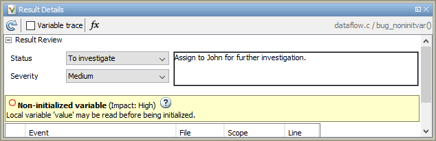 Der Fensterbereich Result Details zeigt außerdem eine Abfolge von Ereignissen, die zu dem Ergebnis geführt haben. Für das Non initialized variable-Ergebnis werden beispielsweise die folgenden Ereignisse angezeigt:
