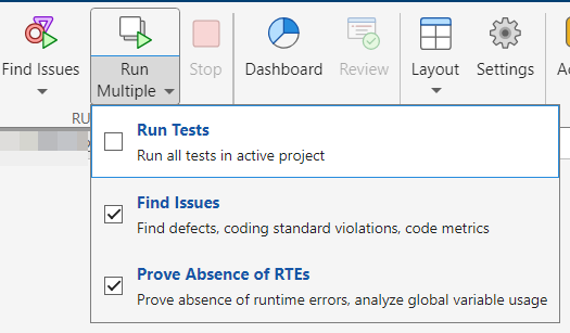 On the Project tab, from the dropdown Run Multiple, select Find Issues and Prove Absence of RTEs. Start an analysis that performs both a Bug Finder and a Code Prover run by clicking Run Multiple.