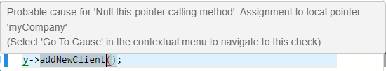 Follow one or more of these steps until you determine a fix for the Null this-pointer calling method check. For a description of the check and code examples, see Null this-pointer calling method.