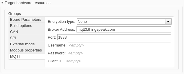 Target hardware resources, in theGroupsection, selectMQTT. For more information on how to configure the MQTT properties, see Model Configuration Parameters for NVIDIA Hardware Board. Use the same parameters as set while you create a ThingSpeak MQTT device.In the External mode section, ensure that the Communication interface is set to