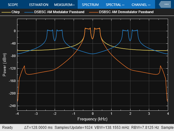 Plot the input signal, the modulated sidebands, and the demodulated signal by using a spectrum analyzer.