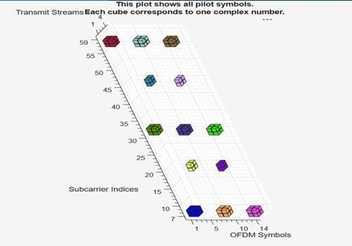 pilotcfg = ofdmPilotConfig with properties: FFTLength: 64 NumGuardBandCarriers: [2×1 double] NumSymbols: 14 NumTransmitStreams: 2 StreamGroups: {[1 2]} PilotLocations: {[2×2×52 double]} PilotSymbols: {[2×2×52 double]}StreamGroups: {[1 2]}value shows that both streams are grouped together. At each pilot location, both streams transmit pilot symbols at the same time and frequency, but with different orthogonal values.PilotLocations: {[2-by-2-by-52 double]}is a 3-D array showing the placement of pilot symbols. First dimension is the number pilot locations per cluster. Each location is a [subcarrier;symbol} pair. Second dimension is always 2 representing a two-element coordinate where one coordinate is the subcarrier index and the other coordinate is OFDM the symbol index. Third dimension is the number of clusters.PilotSymbols: 2-by-2-by-52 doubleis a 3-D array of the actual pilot values. First dimension is the number of pilot symbols per cluster. Second dimension is the number of streams per group. Third dimension is the number of clusters. Each cluster has a 2-by-2 matrix of complex pilot values. Each column corresponds to a stream, and each row to a pilot in the cluster. These are chosen so that, in each cluster, the pilots sent by the two streams are orthogonal.