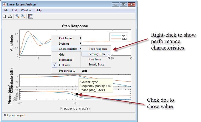 Analysieren Sie die Systemleistung. Sie können zum Beispiel die Spitzenantwort im Bode-Diagramm und die Einschwingzeit im Sprungantwortdiagramm analysieren.