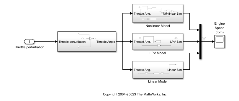 Dieses Beispiel demonstriert, wie Sie ein lineares parametervariantes Modell (LPV) einer Motordrehzahl mit dem LPV System-Block simulieren können. Der LPV System-Block interpoliert ein Zustandsraum-Array, um die LPV-Antwort zu modellieren. Üblicherweise erstellen Sie ein derartiges Array, indem Sie ein nicht lineares Modell über einen Bereich von Betriebsbedingungen hinweg im Batch linearisieren. Dieses Beispiel umfasst ein linearisiertes Ergebnis des Motordrehzahlmodells in scdspeedlpvData. Weitere Informationen zur Linearisierung dieses Modells finden Sie unter Linearize Engine Speed Model (Simulink Control Design).