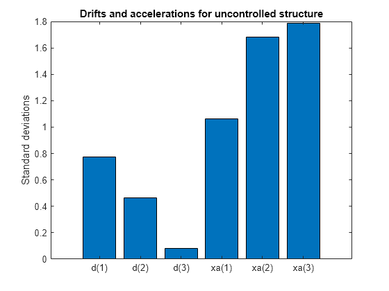% Add Kanai-Tajimi filter to the plant PF = P*append(F,1); % Standard deviations of open-loop drifts CV = covar(PF('d','n'),1); d0 = sqrt(diag(CV)); % Standard deviations of open-loop acceleration CV = covar(PF('xa','n'),1); xa0 = sqrt(diag(CV)); % Plot open-loop RMS values clf bar([d0; xa0]) title('Drifts and accelerations for uncontrolled structure') ylabel('Standard deviations') set(gca,'XTickLabel',{'d(1)','d(2)','d(3)','xa(1)','xa(2)','xa(3)'})