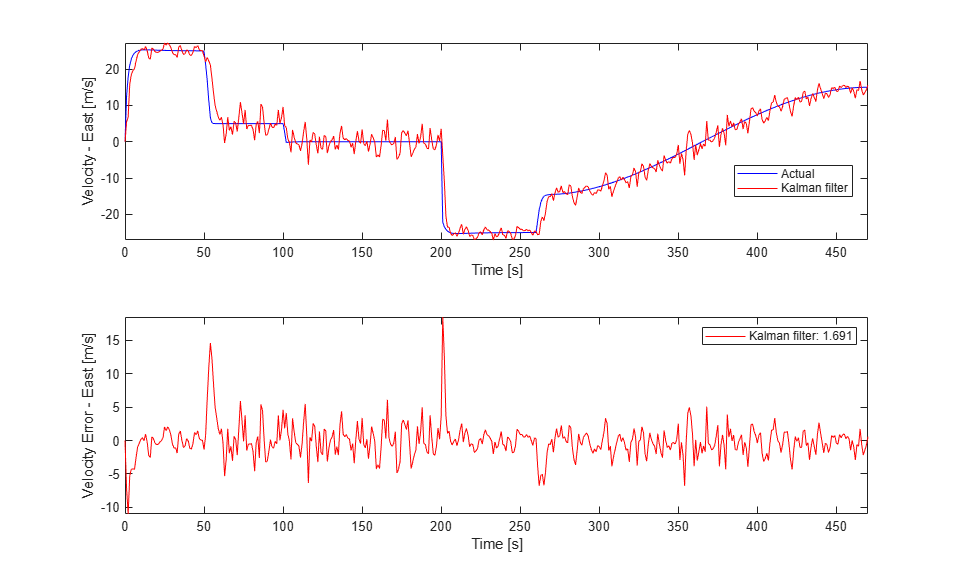 e_ve = xhat(:,3)-x(:,3); % [m/s] Kalman filter east velocity error e_vn = xhat(:,4)-x(:,4); % [m/s] Kalman filter north velocity error figure % Velocity in east direction and its estimate subplot(2,1,1) plot(t,x(:,3),"b",t,xhat(:,3),"r") ylabel("Velocity - East [m/s]") xlabel("Time [s]") legend("Actual","Kalman filter",Location="best") axis tight subplot(2,1,2) % Estimation error plot(t,e_ve,"r") ylabel("Velocity Error - East [m/s]"); xlabel("Time [s]") legend(sprintf("Kalman filter: %.3f",norm(e_ve,1)/numel(e_ve))) axis tight