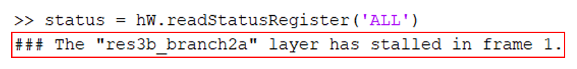 To diagnose the hardware stall, retrieve the debug register status by using the readStatusRegister method of the dlhdl.Workflow object. For more information, see readStatusRegister.