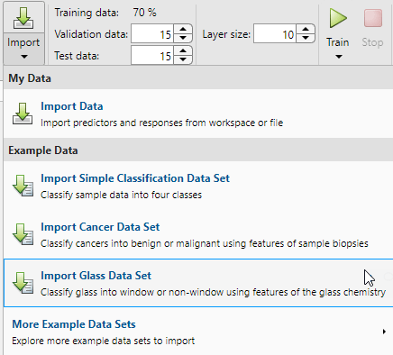 Wählen Sie zum Importieren von Daten zur Klassifizierung von Glas die Optionen Import > Import Glass Data Set (Glasdatensatz importieren) aus. Mit diesem Datensatz können Sie ein neuronales Netz trainieren, das anhand der chemischen Eigenschaften von Glas klassifiziert, ob es sich um Fenster oder Nicht-Fenster handelt. Wenn Sie Ihre eigenen Daten aus einer Datei oder aus dem Arbeitsbereich importieren, müssen Sie die Prädiktoren und Antworten angeben und festlegen, ob die Beobachtungen in Zeilen oder Spalten vorliegen.