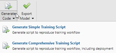 Wählen Sie Generate Code > Generate Simple Training Script (Einfaches Trainingsskript generieren) aus, um MATLAB-Programmcode zu erstellen, mit dem die vorherigen Schritte über die Befehlszeile reproduziert werden können. Das Erstellen von MATLAB-Programmcode kann hilfreich sein, wenn Sie lernen möchten, wie die Befehlszeilenfunktionen der Toolbox zum Anpassen des Trainingsprozesses genutzt werden können. In Mustererkennung mithilfe von Befehlszeilenfunktionen werden Sie die generierten Skripte näher untersuchen.
