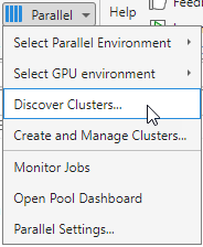 This selection opens the Discover Clusters dialog box, where you can search for MATLAB Parallel Server™ clusters.