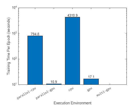 accuracy = results.accuracy; trainingTime = results.trainingTime; trainingEpochs = results.trainingEpochs; executionEnvironments = results.executionEnvironments; executionEnvironments = "\fontname{monospace}" + executionEnvironments; figure b = bar(executionEnvironments,trainingTime./trainingEpochs); b(1).Labels = round(b(1).YData,1); xlabel("Execution Environment") ylabel("Training Time Per Epoch (seconds)") yscale("log")