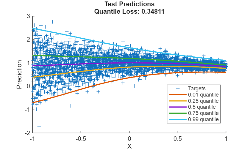 hold on for i = 1:numQuantiles plot(X,Y(:,i), ... DisplayName=quantiles(i) + " quantile", ... LineWidth=2) end xlabel("X") ylabel("Prediction") hold off legend(Location="Best") title( ... "Test Predictions" + newline ... + "Quantile Loss: " + lossTest)