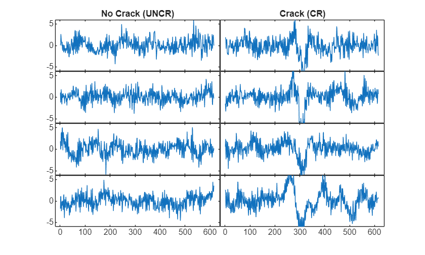 This example uses vertical accelerometer data from the front wheels of passenger vehicles driving at different speeds over cracked and uncracked sections of pavement. For more information, see [1].