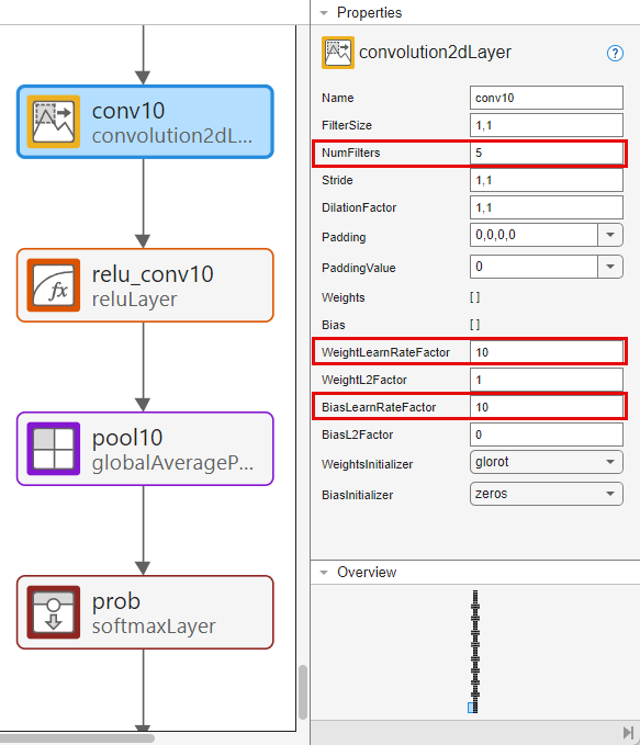 Vor R2023b: Um das Netz an die neuen Daten anzupassen, müssen Sie die Schichten ersetzen, statt sie zu entsperren. Legen Sie in der neuen 2D-Faltungsschicht für „FilterSize“ (Filtergröße) den Wert [1 1] fest.