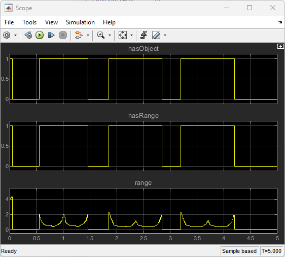 Simulate the model and use the scope to inspect the results. The ultrasonic sensor block calculates range measurements based on the distance between the sensor and the closest point on the detected object. Once the model completes the simulation, the simOut variable is written to workspace and holds a structure with a collection of output variables.
