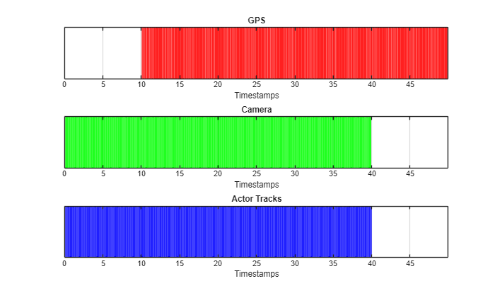 synchronize(gps,cam) synchronize(actorList,cam) helperViewMultiSensorTimes(gps.Timestamps,cam.Timestamps,actorList.Timestamps)