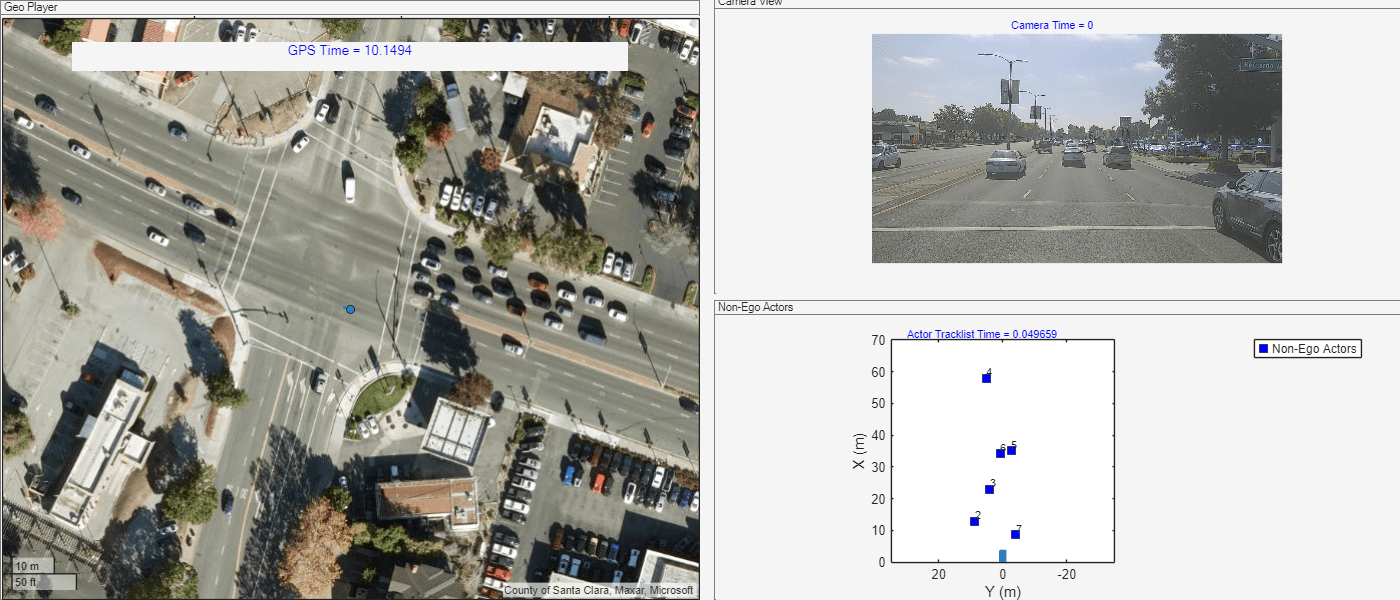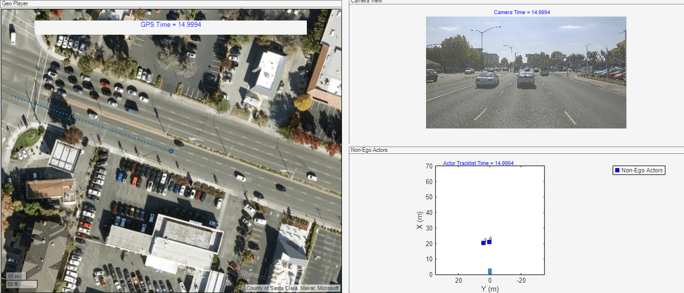 fh = figure(Visible="on",Position=[0 0 1400 600]); % First plot: Geo Player geoPlot = uipanel(fh,Position=[0 0 0.5 1],Title="Geo Player"); geoPlayer = geoplayer(gps.Latitude(1),gps.Longitude(1),19, ... Parent=geoPlot,HistoryDepth=Inf,Basemap="satellite"); gpsTimeLabel = uicontrol(Style="text",Parent=geoPlot, ... Units="normalized",Position=[0.1 0.9 0.8 0.05], ... FontSize=10,HorizontalAlignment="center", ... String="GPS Time = ",ForegroundColor=[0 0 1]); gpsPlotData = {gps,geoPlayer,gpsTimeLabel}; % Second plot: Camera View camPlot = axes(uipanel(fh,Position=[0.51 0.51 0.5 0.5],Title="Camera View")); camPlotData = {cam,camPlot}; % Third plot: Non-Ego Actors hPlot = axes(uipanel(fh,Position=[0.51 0 0.5 0.5],Title="Non-Ego Actors")); bep = birdsEyePlot(XLim=[0 70],YLim=[-35 35],Parent=hPlot); actorListPlotData = {actorList,bep}; skipFrames =1; helperViewMultiSensorData(gpsPlotData,camPlotData,actorListPlotData,skipFrames)