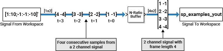 The N-Ratio Buffer block buffers data into blocks of length equal to integer N multiples of the input frame length. The integer ratio N between the output frame length and input frame length is given by the Output-to-input frame length ratio parameter.