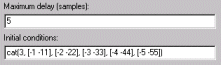 U(2:D+1), where D is the Maximum delay. For a scalar input and the parameters in the next figure, the block initializesU(2:6)with values[-1, -1, -1, 0, 1].