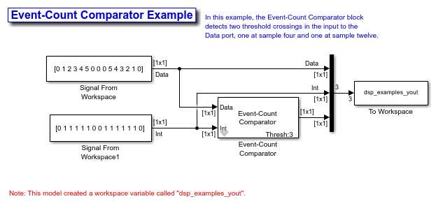 model. The Event-Count Comparator block (Event threshold = 3) detects two threshold crossings in the input to the Data port, one at sample 4 and one at sample 12.