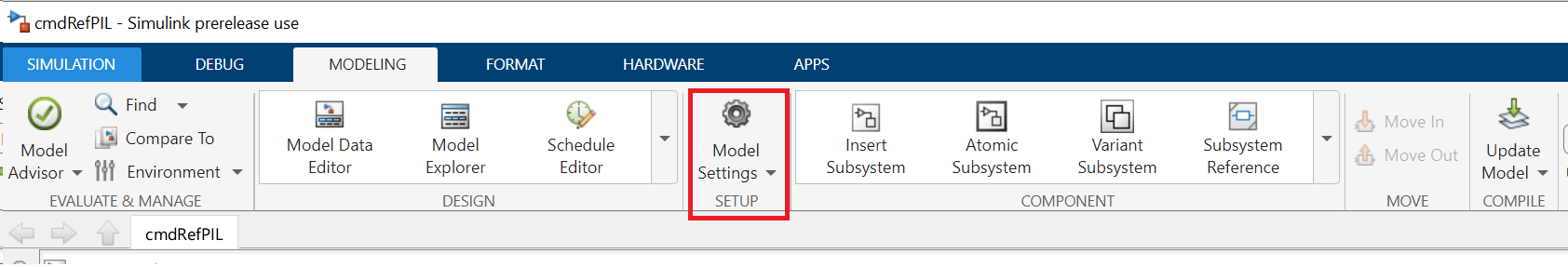 Click the Modeling tab on the Simulink toolstrip and select Model Settings to open the Configuration Parameters dialog box.