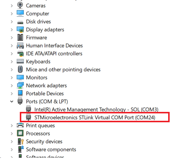 To find the serial port number on a Windows computer, open Device Manager and go to Ports (COM & LPT). Locate the entry labeled STMicroelectronic STLink Virtual COM Port (COMx). Use COMx as the serial port number.
