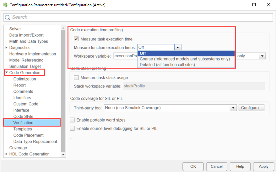 Open Configuration Parameters and navigate to Code Generation > Verification >