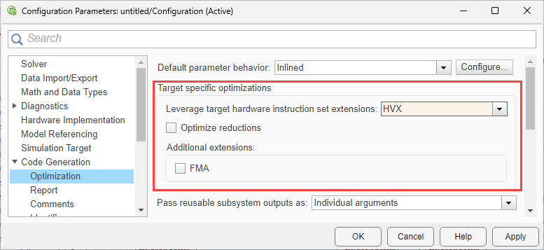 The model configuration parameters for code generation define how the code generator produces code and builds an executable from your model.