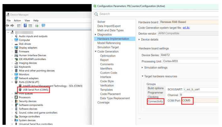 3. Perform the steps listed in Configure the Simulink Model section to select the hardware board and COM port.