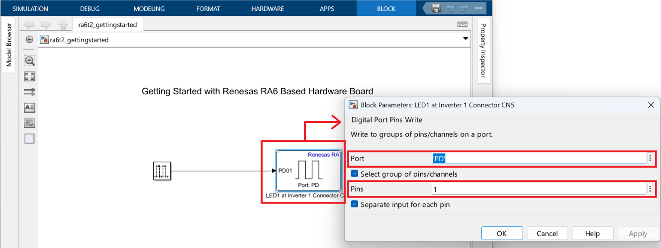 1. In the ra6t2_gettingstarted Simulink model, double-click the Digital Port Pins Read block to open the block parameter dialog box.