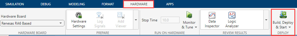 This example shows how to use the Embedded Coder ® Support Package for Renesas® RA Microcontrollers to deploy and simulate a Simulink® model on hardware based on Renesas RA microcontrollers. With this support package, you can access hardware peripherals at run time using Simulink® blocks and configure those peripherals through the Renesas RA Smart Configurator tool.