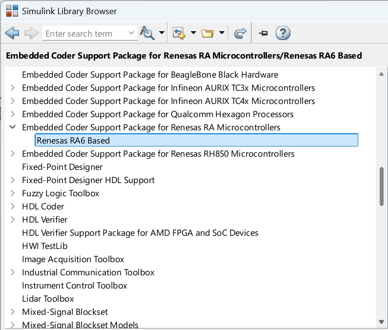 In the Simulink Library Browser, navigate to Embedded Coder Support Package for Renesas RA Microcontrollers.