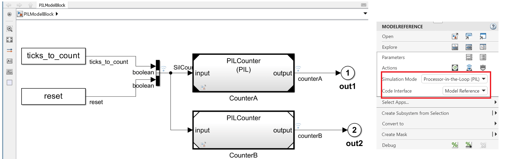 2. Configure and run the CounterA Model block in PIL mode. Right click the CounterA block and select Processor-in-the-loop (PIL) for Simulation Mode option and Model Reference for Code Interface option.