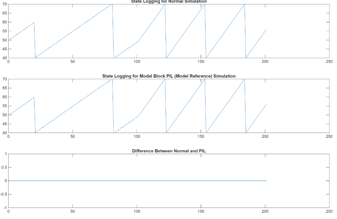 PIL mode: yout2 = out2.logsOut; yout2_pil = yout2.get('counterOut').Values.Data; xout2 = out2.xout; xout2_pil = xout2{1}.Values.Data; Normal Mode: set_param([model '/Counter'],"SimulationMode","Normal"); out2 = sim(model,20); yout2 = out2.logsOut; yout2_normal = yout2.get('counterOut').Values.Data; xout2 = out2.xout; xout2_normal = xout2{1}.Values.Data; fig3 = figure; subplot(3,1,1), plot(yout2_normal), title('Counter Output for Normal Simulation') subplot(3,1,2), ... plot(yout2_pil), title('Counter Output for Model Block PIL (Model Reference) Simulation') subplot(3,1,3), plot(yout2_normal-yout2_pil), ... title('Difference Between Normal and PIL'); fig4 = figure; subplot(3,1,1), plot(xout2_pil), title('State Logging for Normal Simulation') subplot(3,1,2), ... plot(xout2_normal), title('State Logging for Model Block PIL (Model Reference) Simulation') subplot(3,1,3), plot(xout2_normal-xout2_pil), ... title('Difference Between Normal and PIL');
