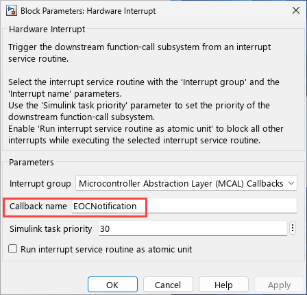 The Hardware Interrupt block reacts to ADC completion. Double click the Hardware Interrupt block to open the block parameters dialog.