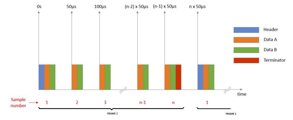 Note: The ideal sampling time of signal to achieve real-time plotting (single-signal logging) is 50 μs with packet size of 600x1, resulting in a data packet every 0.03ms.