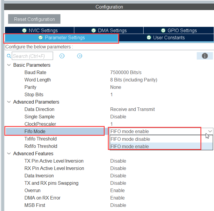 To improve performance and reduce overruns, it is also recommended that you enable FIFO mode in the STM32CubeMX, as shown in the below image.