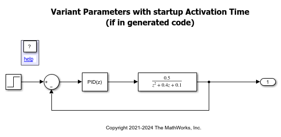 The PID Controller block has two variant parameters, Proportional(P) and Integral(I). The parameters are specified as Simulink.VariantVariable objects Kp and Ki. Kp and Ki have multiple values and are associated with a Simulink.VariantControl object VCtrl, as specified in the slexVariantParameterGain.m file. In this file, the activation time of VCtrl is specified as startup. So, the executable that you build from this model determines the active value of Kp and Ki at the start of its execution by reading the value of VCtrl from the slexVariantParametersStartup_VCtrl.txt file. Since, the value of VCtrl is specified as 1, the executable calculates the step response for the values associated with VCtrl == 1. To calculate the step response for a different value of VCtrl, change the value of VCtrl in the slexVariantParametersStartup_VCtrl.txt file and run the executable again.