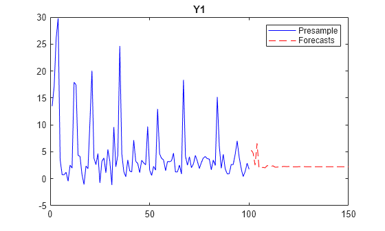 Figure contains an axes object. The axes object with title Y1 contains 2 objects of type line. These objects represent Presample, Forecasts.