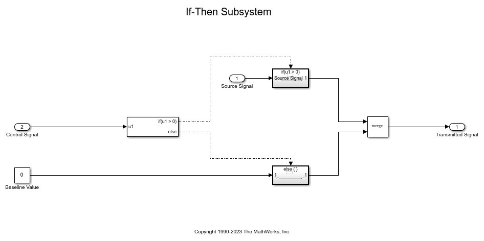 This model has two inputs, Source Signal and Control Signal. The value of the output is determined by the value of the Control Signal. The Transmitted Signal value is equal to the Source Signal value if the Control Signal value is greater than zero. Otherwise the Transmitted Signal is equal to the Baseline Value.