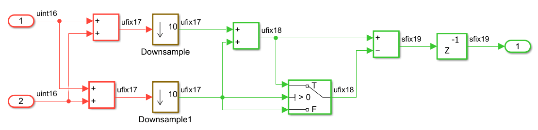 This example demonstrates a multirate design where different sections of the signal processing chain operate at different sample rates. Downsample blocks introduce the multiple rates in the model. In Each Downsample block, the a Sample offset parameter is 0.