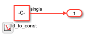 As Constant_subsys2 uses single data types and the model has Native Floating Point mode enabled, when you generate HDL code for the DUT, the Constant_subsys2 becomes a candidate for the optimization that simplifies constant operations. When you open the generated model, you see a Constant block directly connected to the output port.